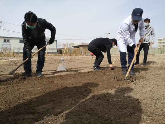 在实验基地,党员们按照分工,分别进行翻地、施肥、平地、测量、开沟、播种等一系列春耕活动,完成5个品种16个小区的小麦试验田种植。
