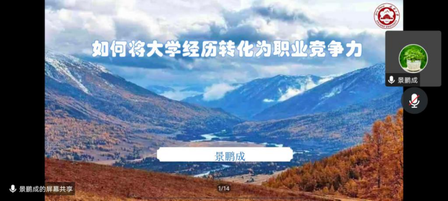 11月21日下午,yl9193永利集团邀请2016届优秀校友,现新疆大学法学院学生工作办公室副主任景鹏成在线上为学院师生作了题为“如何将大学经历转化为职业竞争力”的报告,学院300余名学生参加报告会。
