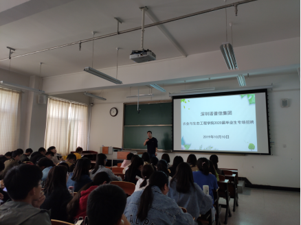 2019年10月10日下午,深圳诺普信农化股份有限公司在我校进行了2020届毕业生专场招聘宣讲会,招聘涉及农学、园艺、种子科学与工程等涉农专业。招聘会期间,企业负责人面向学生进行了招聘宣讲,学生针对工作岗位、薪资待遇等问题与负责人进行了沟通交流。经过宣讲,学院多名学生会后与企业负责人进行了深入交流,并达成初步意向。
