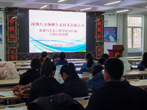 深圳八方纵横生态技术有限公司于10月28日下午来校举办我院秋学期第五场2021届毕业生专场宣讲招聘会,招聘涉及我院三个专业。企业负责人向学生介绍了企业情况、发展前景、薪资待遇等情况,学生与负责人进行了沟通交流。部分学生积极投递简历,后续企业将筛选简历开展网络面试等工作。