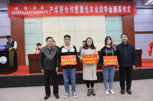 颁奖仪式前,学院负责人与张掖市德光农业科技开发有限责任公司负责人分别签署产学研合作协议和德光农业助学金捐赠协议;徐德桢与张掖市德光农业科技开发有限责任公司负责人共同为产学研合作基地揭牌;张汉燚为张掖市德光农业科技开发有限公司总经理、永利官网优秀校友赵文勤先生颁发客座教授聘书。